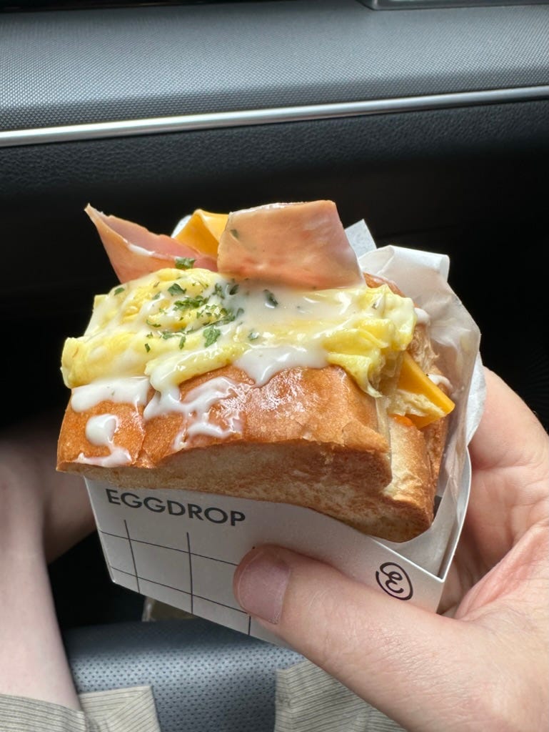 This is a Korean-based chain that sells what is essentially scrambled egg sandwiches. It’s actually better than it sounds. First, the eggs are still quite hot (as Koreans also like things so hot that it makes me wonder if there’s some kind of cultural masochism going on), you can get them with the usual suspects (ham, cheese, and even some very Korean toppings such as bulgogi which is marinated, shredded beef). I have never had anything like this and the Brits made it look so yummy that it was definitely on my list of things to try while in Korea. I do have to admit that the local H-Mart (a Korean grocery store chain that conveniently has a location in Austin, Texas where we live) has a vendor in their food court that makes egg sandwiches but I had not yet tried them. I was waiting to try the real thing in South Korea itself. It’s just a different experience entirely when the person making the food does not understand a word you are saying. And to be fair, I’m in their country. So we stopped by the local Eggdrop where after a few taps on a computer kiosk (which they already had in Korea the last time we visited in 2017 - come on America, get with the program), I somewhat patiently waited for what I was hoping would be a unique dining experience. Because we were going to continue our driving tour of the island, I got it to go.