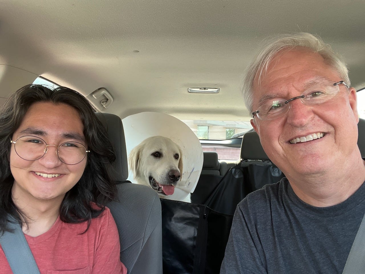 Because of his surgery, he was wearing the cone of shame (actually called an Elizabethan Collar - talk about putting lipstick on a pig), and was acting as if he was still lethargic from the anesthesia. As a result, I had to lift all 70 pounds of him into the back seat of the car. We then began the 90 minute drive back to Austin starting off in San Antonio rush hour traffic. As we slowly left the city, our foster dog was finding it awkward to move around the backseat wearing the cone of shame. He then decided that the best possible place in the car was in the cargo area behind the back seat. He then climbed over the seats which was unfortunate given the hatchback cover was extended. I thought for sure it had been destroyed. A few minutes later, we were able to pull over to find that as soon as he had put pressure on it, it had snapped closed. It was still functional and the damage was quite minimal. Good design, Toyota!