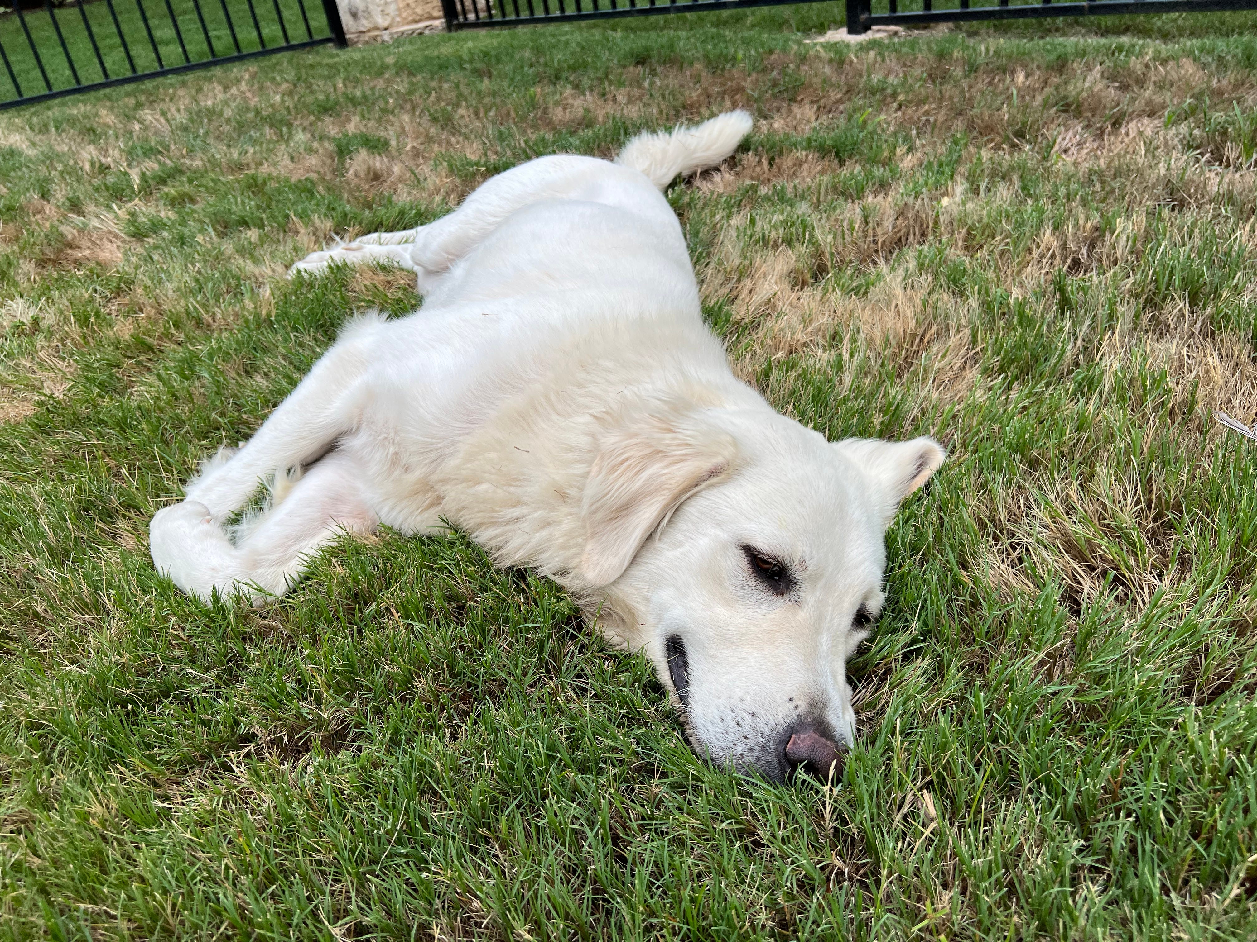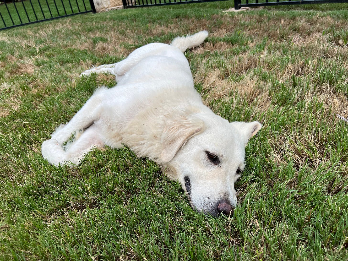 While Golden Retrievers are number four on the list of most intelligent dog breeds, Great Pyrenees are not quite so gifted. They come in at number 64. They are also described as stubborn, taking 40 to 80 repetitions to learn a command. It took just two days for Teddy to learn the sit command. I also make him sit and wait every time I feed him. In just a few days he began sitting on his own while waiting for the command to eat. He hasn’t entirely got this down yet as I think he finds the idea of food appearing on a regular schedule so exciting that he just can’t contain himself. We have been crate training him as well. If you’re unfamiliar with this, the idea is that when you are not watching your dog (while you are asleep or away from home), they are in an animal crate of sufficient size. Because dogs don’t want to poop or pee where they sleep, they learn to hold it. Dogs also can’t understand why you are upset that they chewed up your shoes unless you catch them in the act. Being in the crate prevents this from happening. The first night, Teddy whimpered quite a bit before settling down to sleep. The second night he whimpered even more. The third night he didn’t whimper at all. And the fourth night, almost unbelievably, he went into the crate on his own to go to sleep. He loves being outdoors and because of this, he has decided to choose a very small area in the far corner of the backyard to do his business keeping the rest clean for rolling around in. He’s been here for a week and has not had a single accident in the house. That’s odd for a dog that likely didn’t grow up inside a home. He gives himself a massage by rubbing himself against the rods of our metal fence doing one side and then the other. Our backyard gate doesn’t close completely and despite Trixie being a member of a very intelligent breed, it never occurred to her to test the gate. It took Teddy a day to figure out he could push it open. Now it’s got a bungie cord to keep it shut. He has also thwarted all of our attempts to keep in from going upstairs (which is carpeted and will not be open to him until he’s had a bath after he gets his stitches out). He finally bypassed the barrier we created completely after watching Sam avoid it. In short, Teddy seems to be a fast learner, nothing like the slow and stubborn profile of a Great Pyrenees.