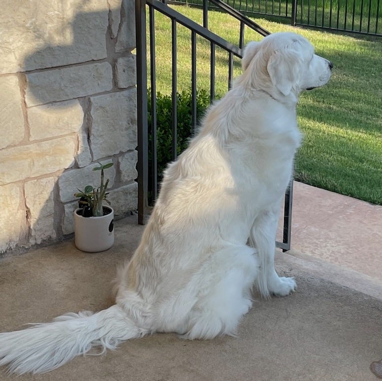 The rest of the drive was quiet. Although it took 15 minutes longer, we avoided the main freeway (the dreaded I-35) instead taking the back way home through rolling tree-filled hills and several small Texas towns. Sam agreed that it was worth the extra time. We serendipitously arrived just as Jeannie did with a brand new bag of dog food. We got him out of the car then led him inside so he could get used to his new, though likely temporary surroundings. After consulting the Internet, Jeannie announced that our foster dog was not an English Golden Retriever and was indeed a Great Pyrenees. Again, they look very similar. Consider these two pictures: