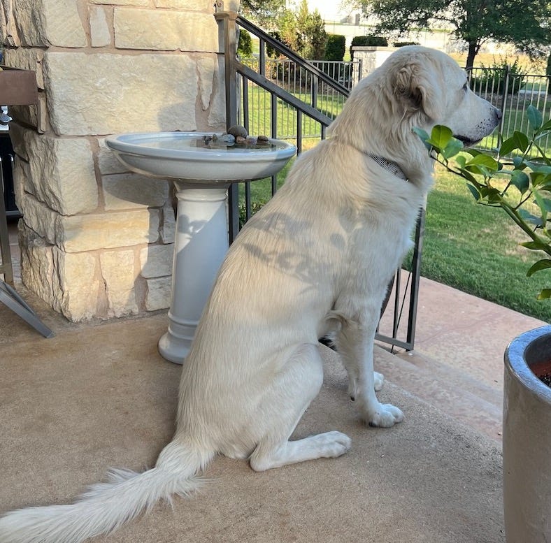 This has led us to believe that he’s almost certainly a mix. We don’t know what he’s mixed with, but it’s something smarter than a Great Pyrenees. I’ve ordered a Doggie DNA kit so we will know in a few weeks. Teddy also rarely barks. In fact for the first few days he didn’t bark at all. Over the last week he’s barked just a few times and even then it’s two to four barks low in both volume and pitch. When out in the backyard, he doesn’t even bark at people or other dogs that go by. Trixie would never allow such an opportunity to go to waste. I don’t know why he’s not much of a barker (so far) but it’s certainly appreciated.